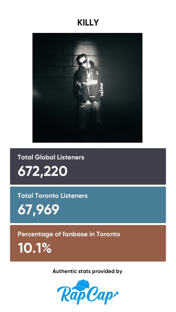Smiley leads the pack with a hefty 1,508,354 global listeners. However, in the context of Toronto, he garners the support of 67,707 listeners, placing him on par with Killy who commands an audience of 67,969 from Toronto.