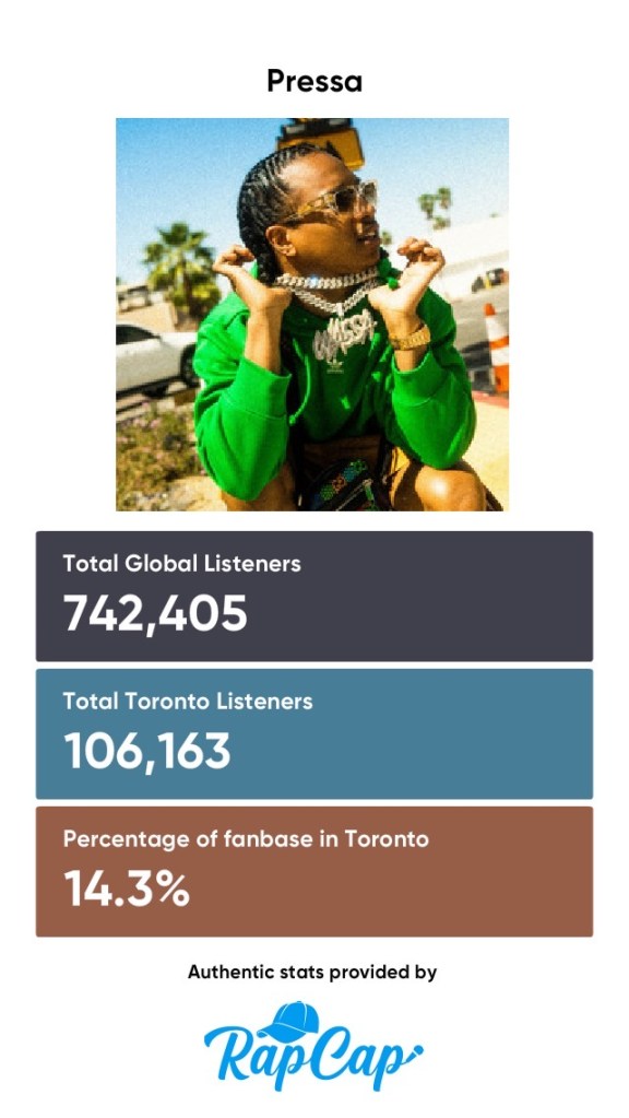 Meanwhile, Pressa, despite having fewer global listeners at 742,405, shows a robust local presence with 106,153 Toronto listeners. This is the highest number of Toronto listeners among the presented artists, underscoring a strong sense of loyalty from his hometown fans.