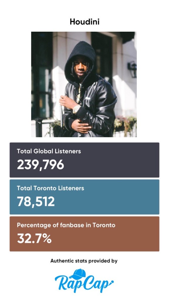 Contrastingly, 6ixBuzz and Houdini, with global listener counts of 440,216 and 239,796 respectively, have an impressive local following, each surpassing the 70,000 mark. This suggests a solid foundation of support within Toronto, which may play a significant role in their global success.